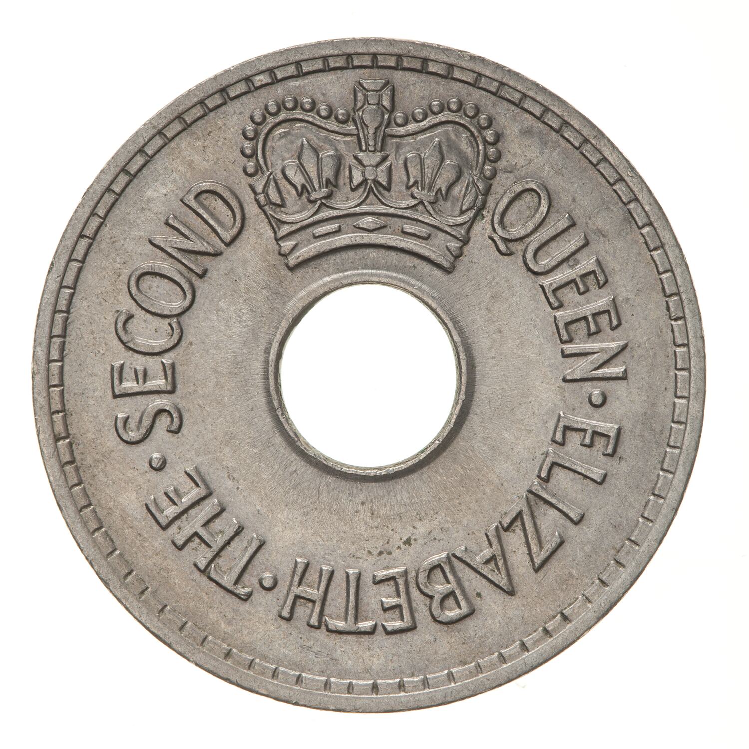 Above central hole, a crown; around hole, QUEEN ELIZABETH THE SECOND