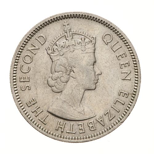 Crowned bust of the Queen facing right; around, QUEEN ELIZABETH THE SECOND