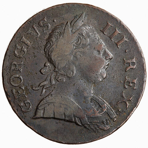 Laureate bust of the King facing right wearing armour; around, GEORGIVS III REX