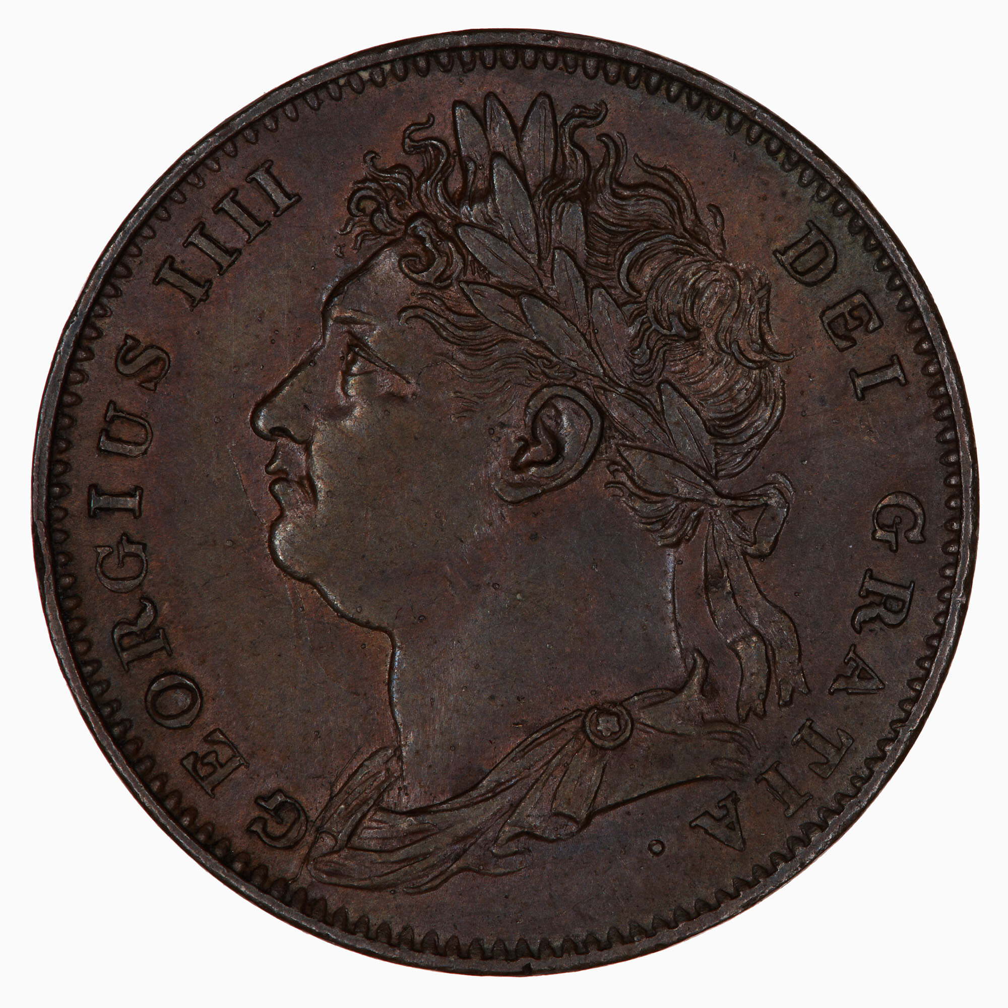 Laureate and draped bust of the King facing left; around, GEORGIUS IIII DEI GRATIA. This coin struck with clashed obverse die, the imprint of Britannia's right arm in front of King's face.