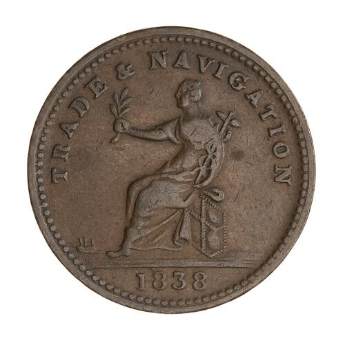Female seated on a bale facing left holding caduceus and extending a palm branch in her right hand, 3 masted sailing ship on horizon at left; around above, TRADE & NAVIGATION; in exergue, 1838