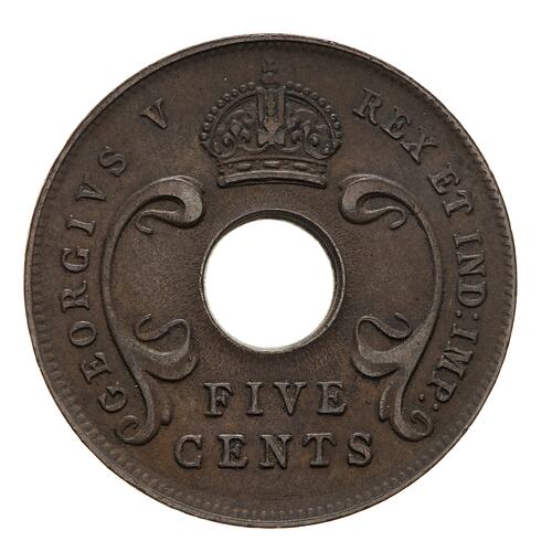 A central hole with curved floral design to left and right; above hole, crown; below hole in two lines, FIVE CENTS; around, GEORGIVS V REX ET IND: IMP: