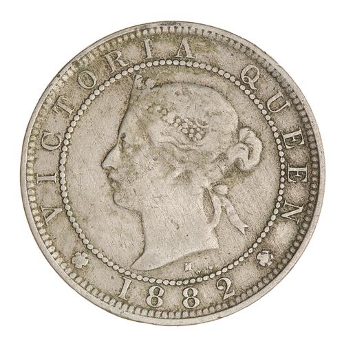 Within a beaded circle, a diademed head of the Queen facing left; around, VICTORIA QUEEN; below between two roses, 1882; the mint mark, H, below the neck