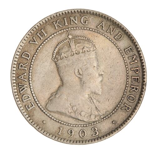 Within a beaded circle, a crowned and draped bust of the King facing right; around, EDWARD VII KING AND EMPEROR; below between two beads, 1903