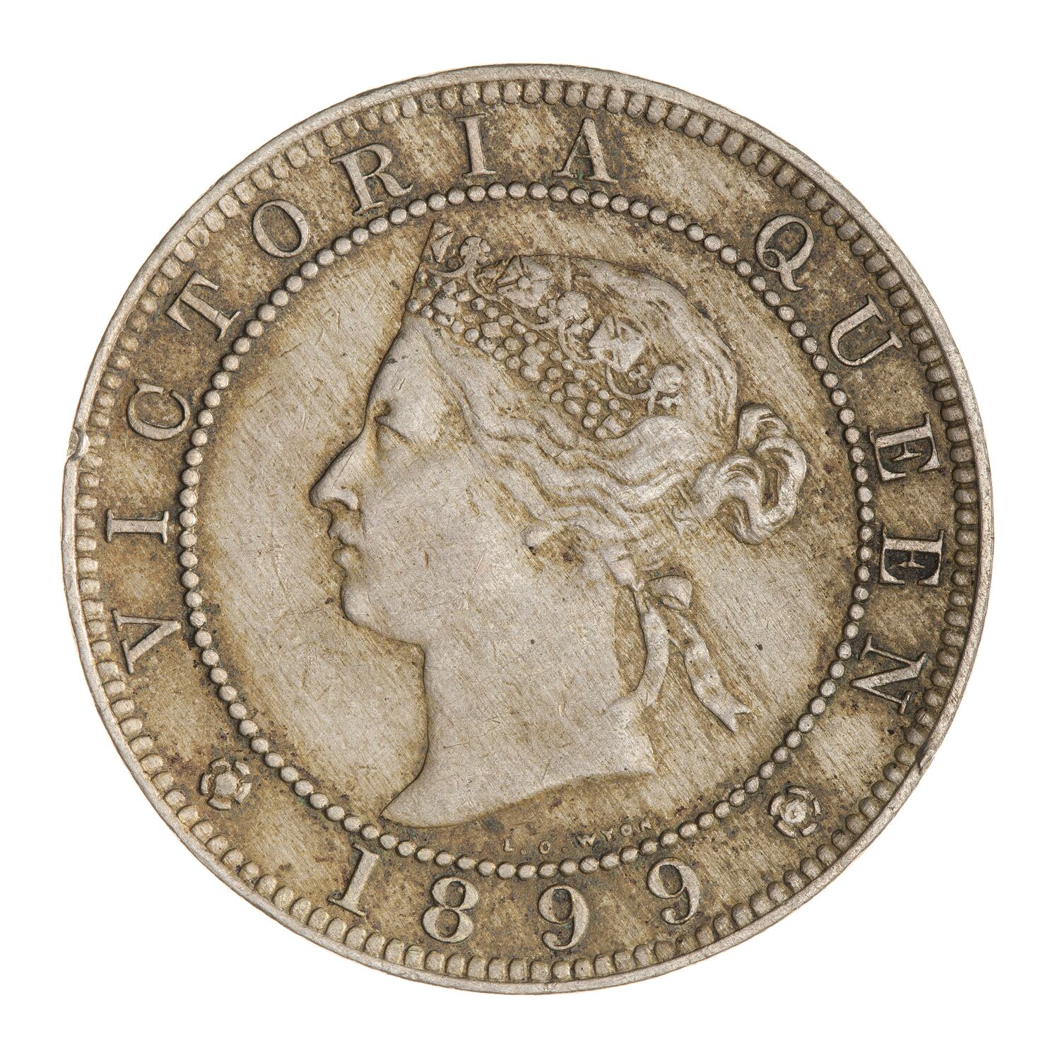 Within a beaded circle, a diademed head of the Queen facing left; around, VICTORIA QUEEN; below between two roses, 1899