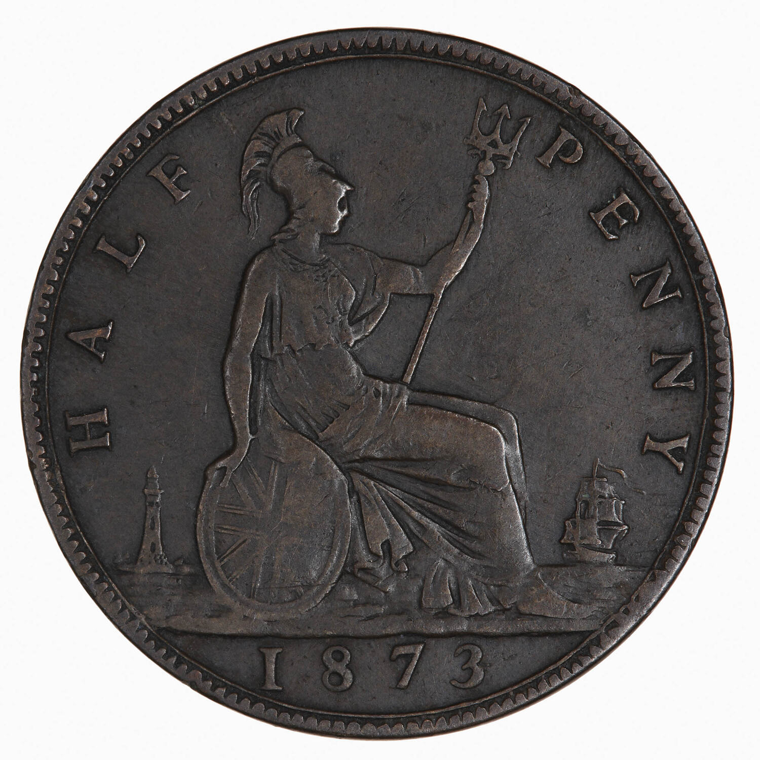Britannia seated facing right on a rock wearing a helmet and breastplate with flowing dress; she holds a trident and rests her right hand on a shield which bears the combined crosses of the Union Flag; at right a ship sailing away; at left, a lighthouse; around, HALF PENNY; in exergue, 1873
