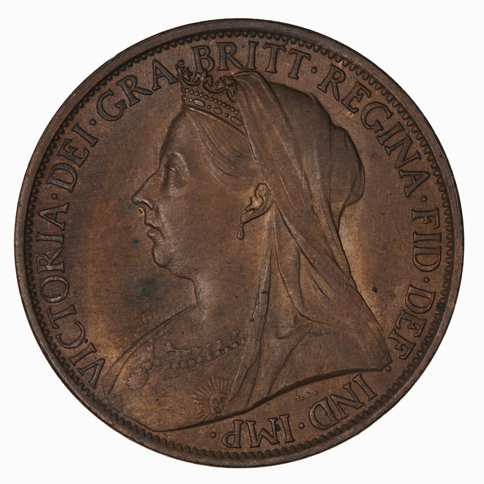 Crowned bust of the Queen facing left wearing veil over back of crown, ribbon and star of the Garter, pearl necklet and pendant; around, VICTORIA DEI GRA BRITT REGINA FID DEF IND IMP; in field below bust the artist's initials, T.B. (Thomas Brock)