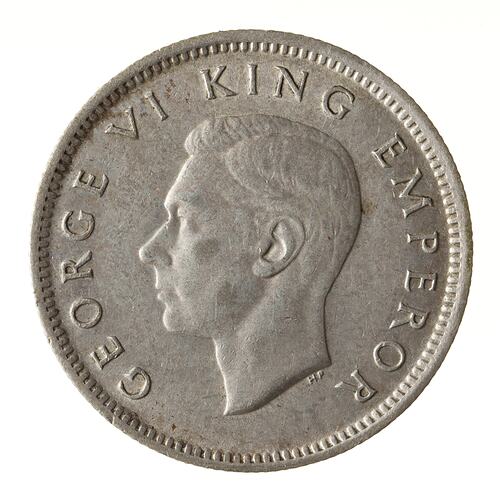 King's head, bare, facing left; around, GEORGE VI KING EMPEROR; below neck truncation in small letters the artist's initials HP ([Thomas] Humphrey Paget)
