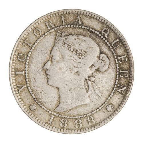 Within a beaded circle, a diademed head of the Queen facing left; around, VICTORIA QUEEN; below between two roses, 1888