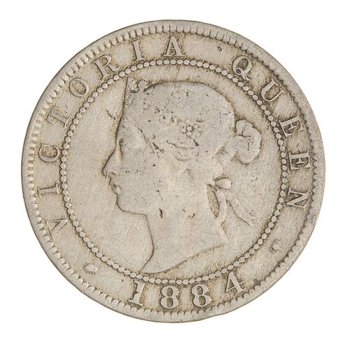 Within a beaded circle, a diademed head of the Queen facing left; around, VICTORIA QUEEN; below between two roses, 1884