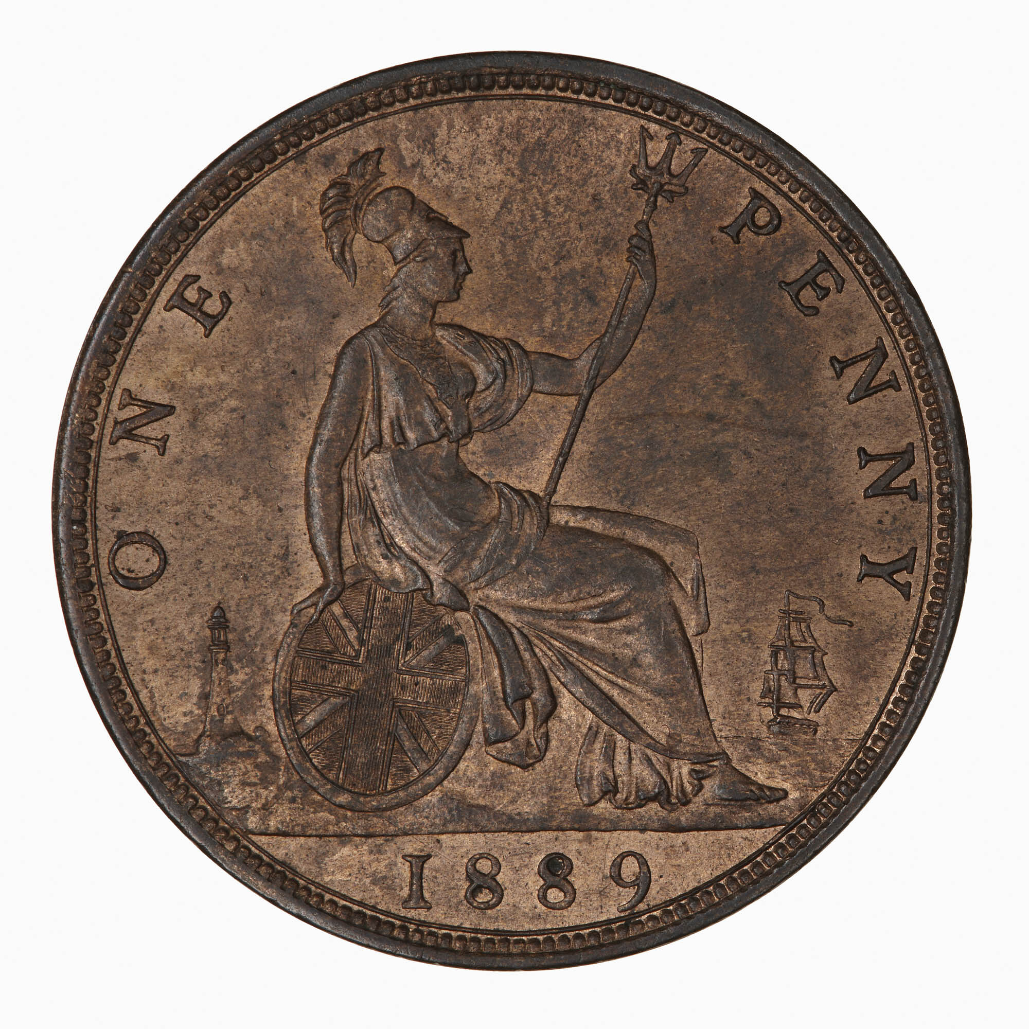 Britannia seated facing right on a rock wearing a helmet and breastplate with flowing dress; she holds a trident and rests her right hand on a shield which bears the combined crosses of the Union Flag; at right a ship sailing away; at left, a lighthouse; around, ONE PENNY; in exergue, 1889