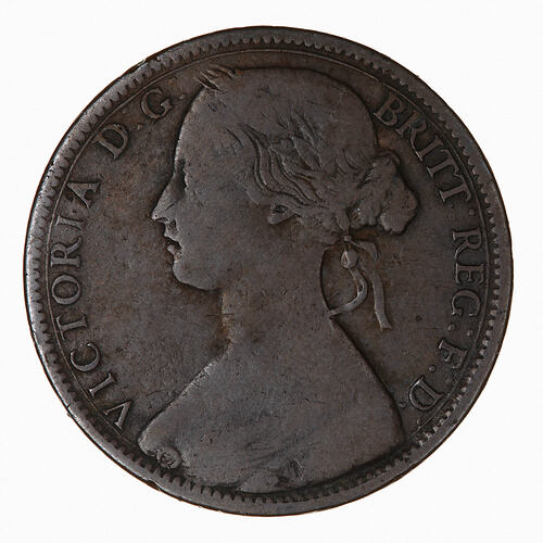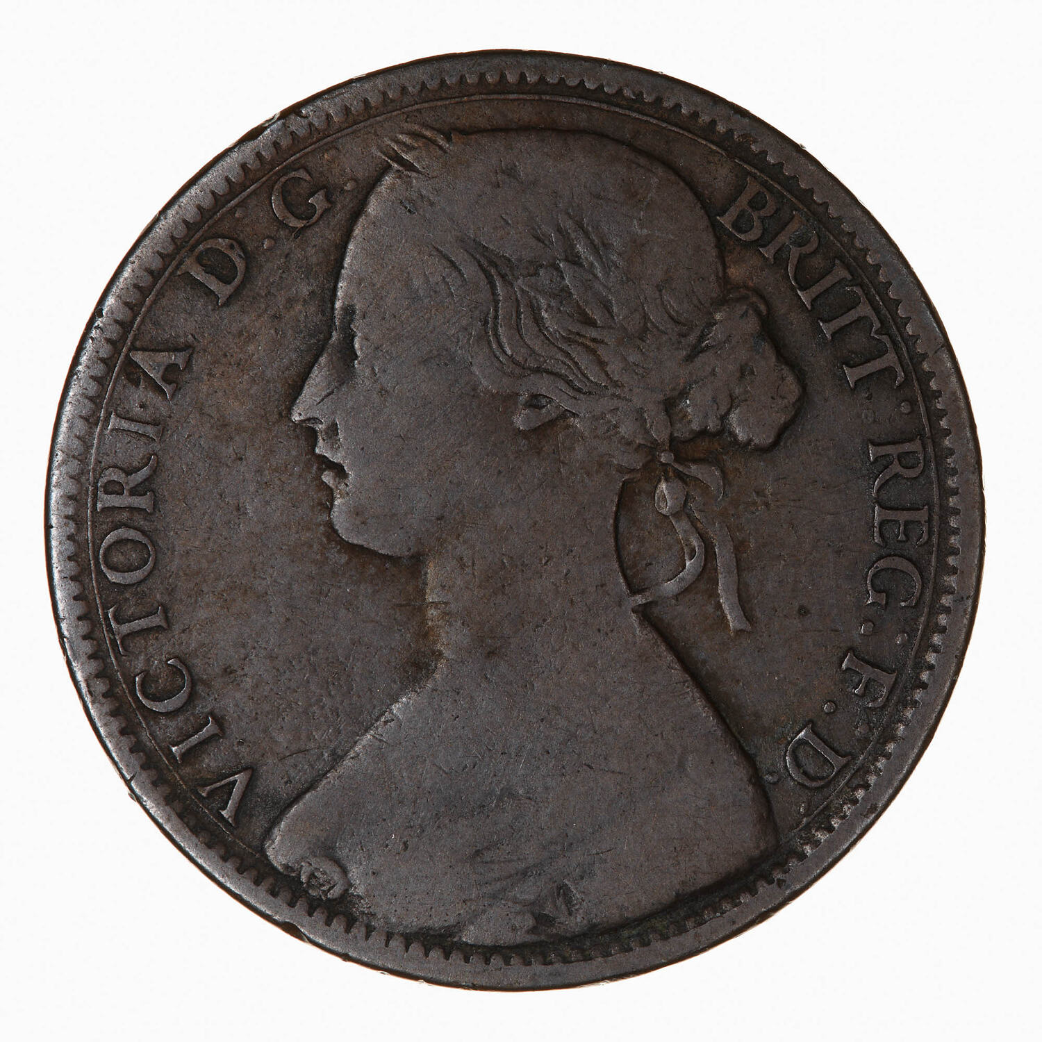 Britannia seated facing right on a rock wearing a helmet and breastplate with flowing dress; she holds a trident and rests her right hand on a shield which bears the combined crosses of the Union Flag; at right a ship sailing away; at left, a lighthouse; around, ONE PENNY; in exergue, 1864