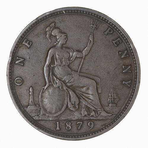 Britannia seated facing right on a rock wearing a helmet and breastplate with flowing dress; she holds a trident and rests her right hand on a shield which bears the combined crosses of the Union Flag; at right a ship sailing away; at left, a lighthouse; around, ONE PENNY; in exergue, 1879.