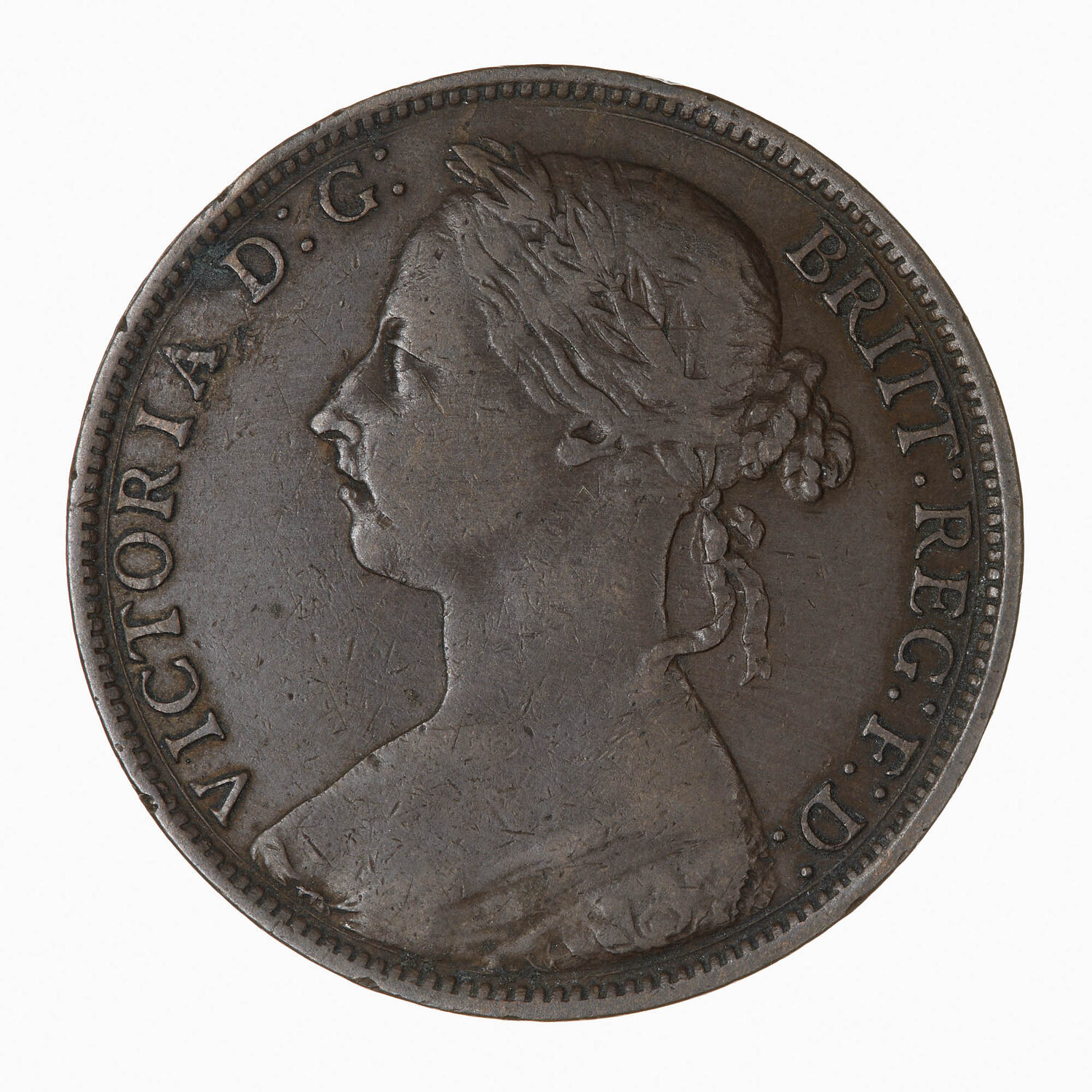 Britannia seated facing right on a rock wearing a helmet and breastplate with flowing dress; she holds a trident and rests her right hand on a shield which bears the combined crosses of the Union Flag; at right a ship sailing away; at left, a lighthouse; around, ONE PENNY; in exergue, 1886