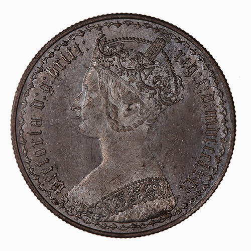 The florin was introduced in 1849 as the first move towards decimalization of the British coinage, it was 1/10th of a pound or 2 shillings. This, the second type, is known as the "Gothic florin" because of the use of Gothic lettering in the legend.