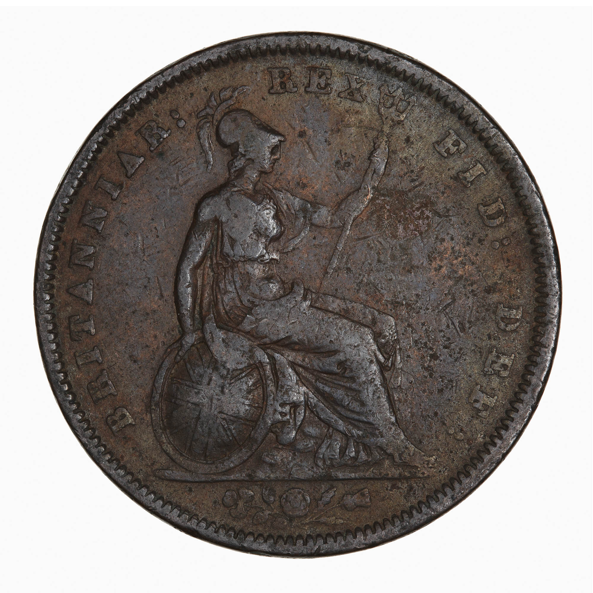 Britannia seated right holding trident and shield; around, BRITANNIAR: REX FID: DEF:; in exergue, a rose, thistle and shamrock united