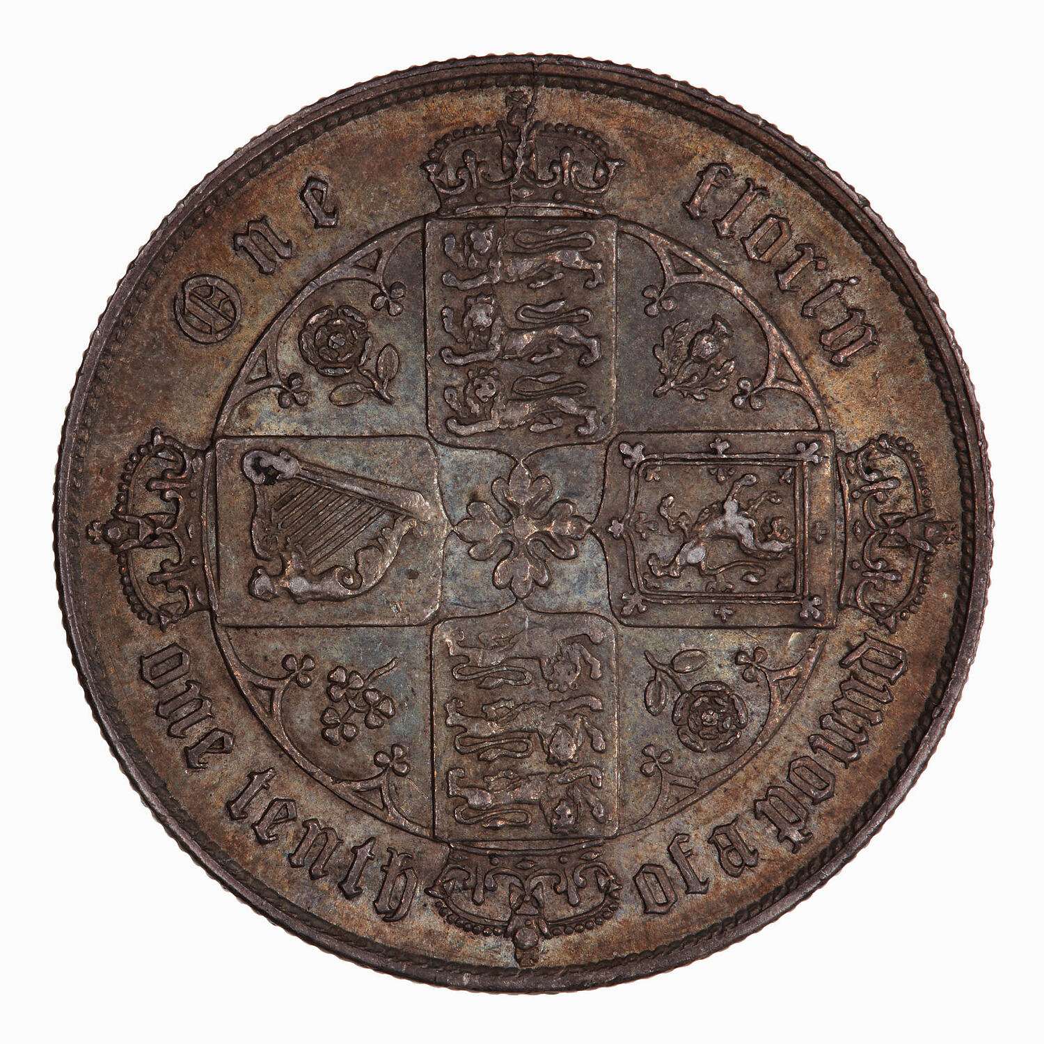 Four crowned shields forming a cross around a rose, the shields bear the arms of England, top and bottom, Scotland at right and Ireland at left; between shields under arched canopy, two roses, a thistle and a shamrock; around above, One florin; around below, one tenth of a pound, in Gothic letters.