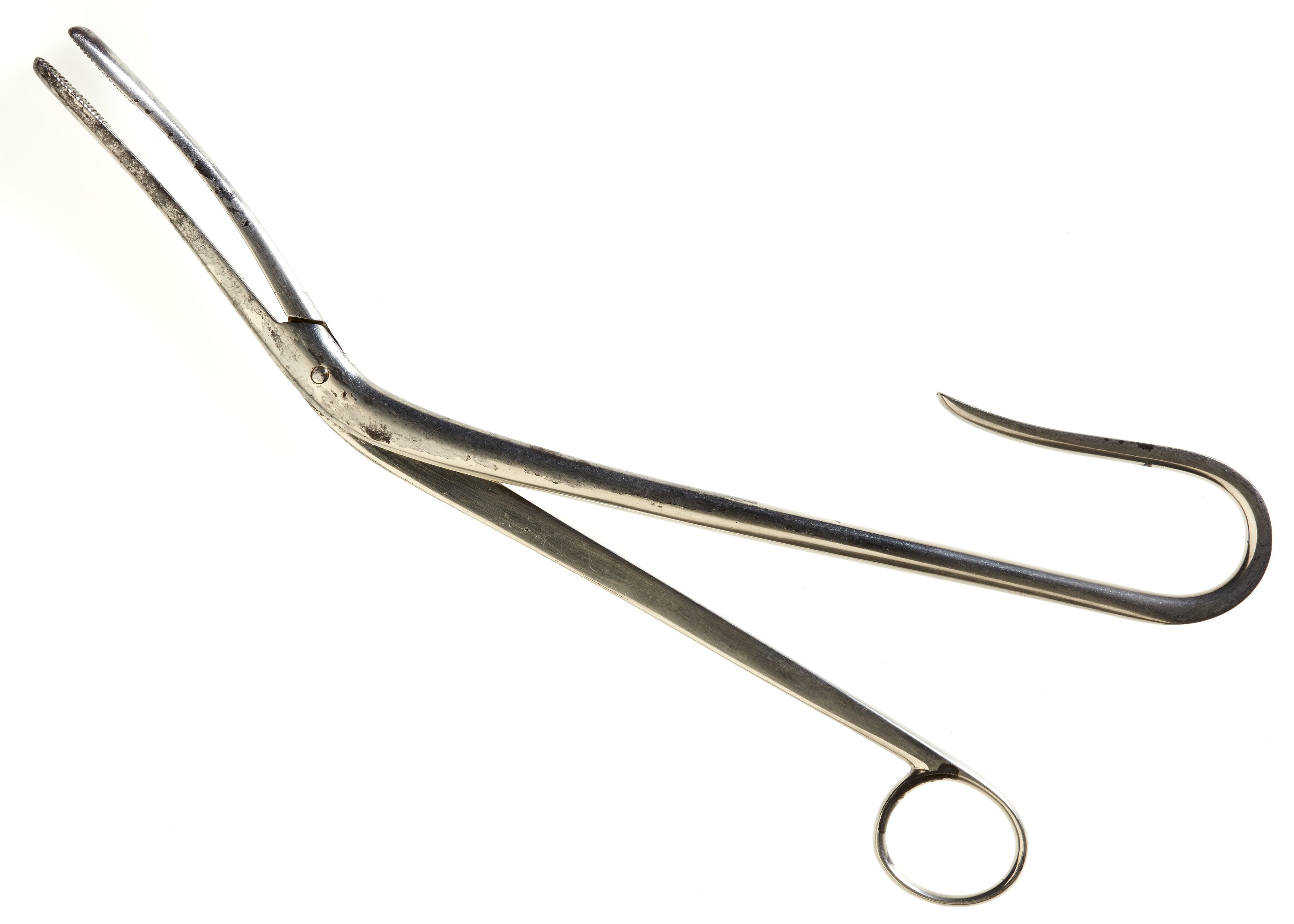 Chromed, metal forceps. The two components are angled at the head. They are joined at the bend via a circular aperture on one and a circular protrusion on the other that fit together when compressed. The ends of each components are shaped into handles - one has a ring grip, the other has been finished in a hook shape. Tips of each component have been flattened and widened slightly at the very end; there is a series of ridges on the interior ends to provide a firm grip. The exterior surface is rusted and flaking off in parts.