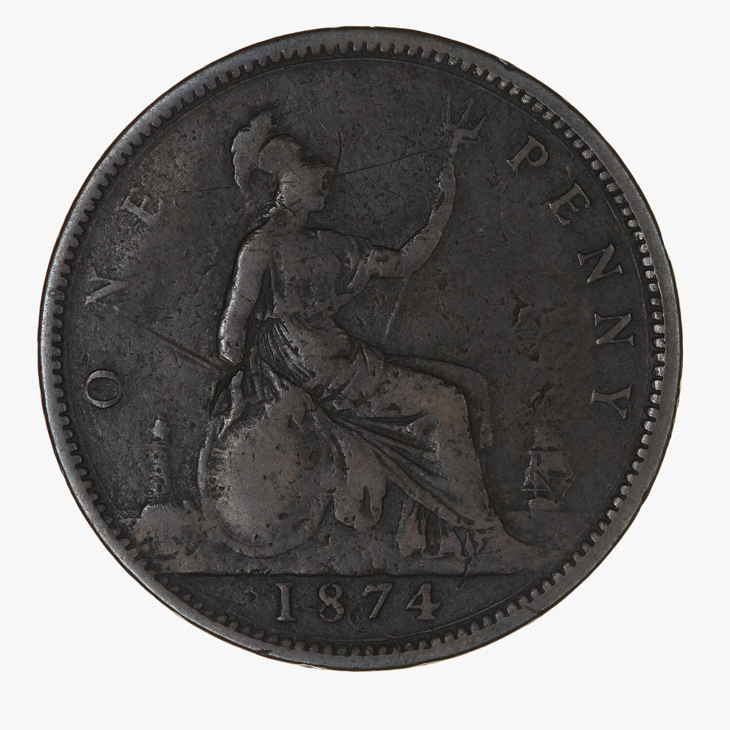 Britannia seated facing right on a rock wearing a helmet and breastplate with flowing dress; she holds a trident and rests her right hand on a shield which bears the combined crosses of the Union Flag; at right a ship sailing away; at left, a lighthouse; around, ONE PENNY; in exergue, 1874