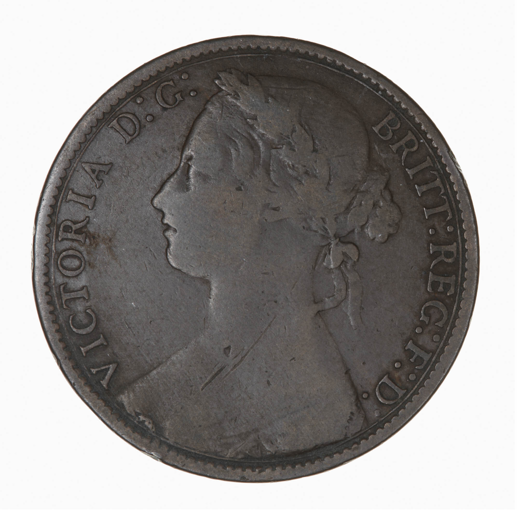 Bust of Queen Victoria facing left wearing bodice and a mantle decorated with rose, thistle and shamrock; in her hair a wreath of leaves and berries tied at back with ribbon, her hair drawn to a plaited bun behind, she wears a circular broach; around, VICTORIA D: G: BRITT: REG: F: D: