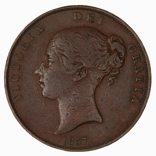 Head of Queen Victoria facing left, ribbon in her hair; incuse on neck truncation the artist's initials W.W. (William Wyon); around, VICTORIA DEI GRATIA; below, 1857
