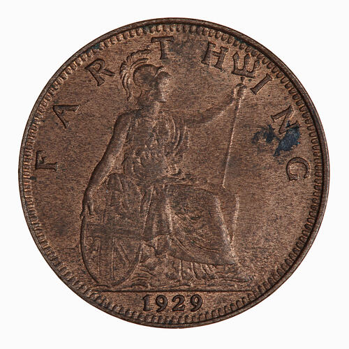 Britannia seated facing right on a rock wearing a helmet and flowing robes; she holds a trident and rests her right hand on a shield which bears the combined crosses of the Union Flag; around above, FARTHING; in exergue, 1929