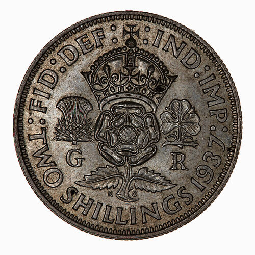 A crowned rose dividing a thistle above the letter G and a shamrock above the letter R; around above, FID: DEF: IND: IMP:; around below,TWO SHILLINGS 1937