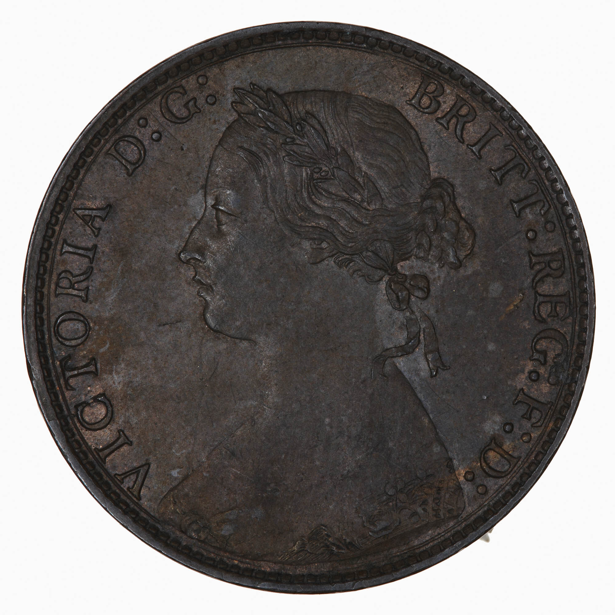 Bust of Queen Victoria facing left wearing bodice and a mantle decorated with rose, thistle and shamrock; in her hair a wreath of leaves and berries tied at back with ribbon, her hair drawn to a plaited bun behind, she wears a circular broach; around, VICTORIA D: G: BRITT: REG: F: D:
