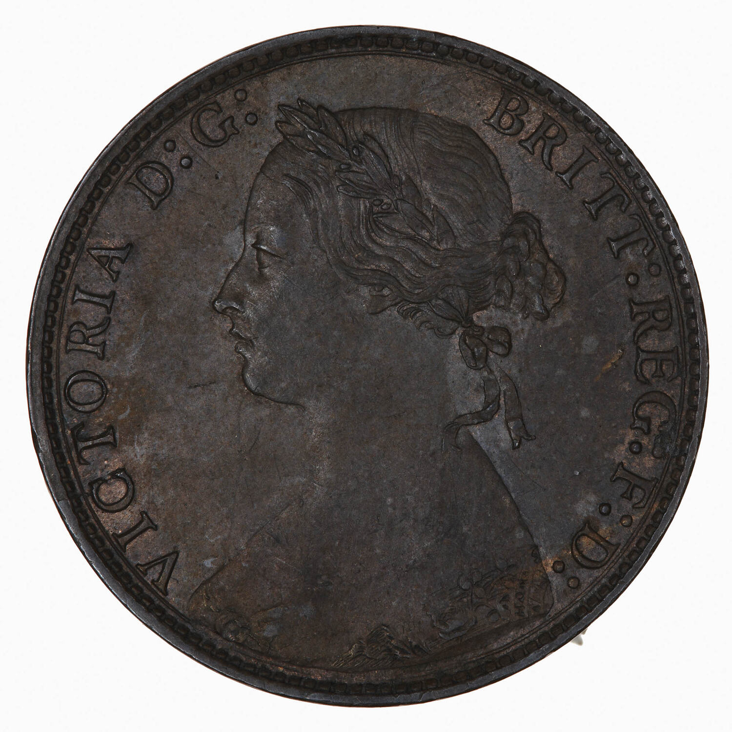 Britannia seated facing right on a rock wearing a helmet and breastplate with flowing dress; she holds a trident and rests her right hand on a shield which bears the combined crosses of the Union Flag; at right a ship sailing away; at left, a lighthouse; around, HALF PENNY; in exergue, 1874; below date, H