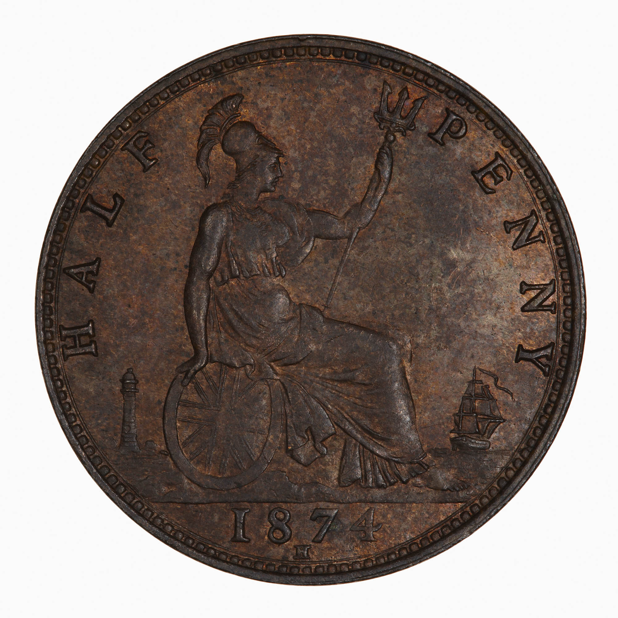 Britannia seated facing right on a rock wearing a helmet and breastplate with flowing dress; she holds a trident and rests her right hand on a shield which bears the combined crosses of the Union Flag; at right a ship sailing away; at left, a lighthouse; around, HALF PENNY; in exergue, 1874; below date, H