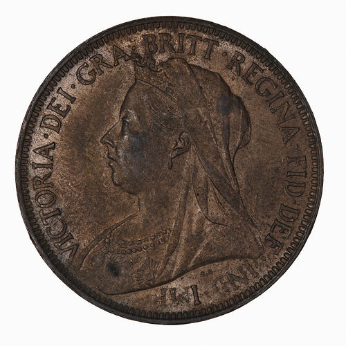 Crowned bust of the Queen facing left wearing veil over back of crown, ribbon and star of the Garter, pearl necklet and pendant; around, VICTORIA DEI GRA BRITT REGINA FID DEF IND IMP; in field below bust the artist's initials, T.B. (Thomas Brock)