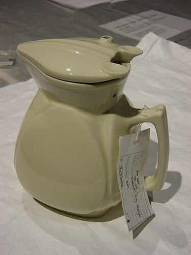 Yellow ceramic electric jug made in Brighton, Melbourne, by Haigh Resistances Pty Ltd, in 1949. It was donated to Museum Victoria by the State Electricity Commission of Victoria, and has an accompanying State Electricity Commission Approval Board label.