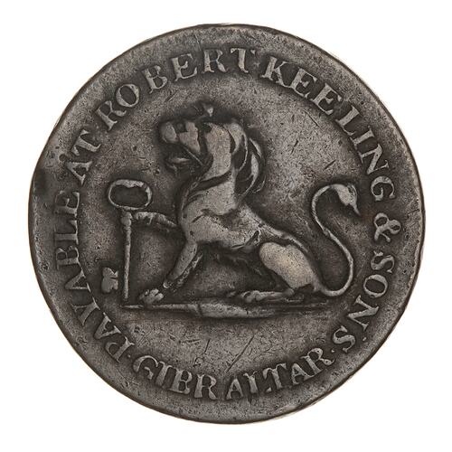 Lion seated facing left holding a key in its right paw; around above, PAYABLE AT ROBERT KEELING & SON'S; below, GIBRALTAR