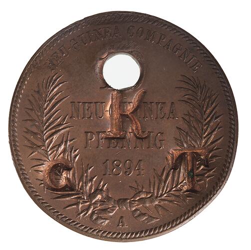 Within wreath, 10 / NEU GUINEA / PFENNIG / 1894; above, NEU GUINEA COMPAGNIE; below, the mint mark for Berlin "A" Note: Large circular hole through denomination counterstamped K / G T