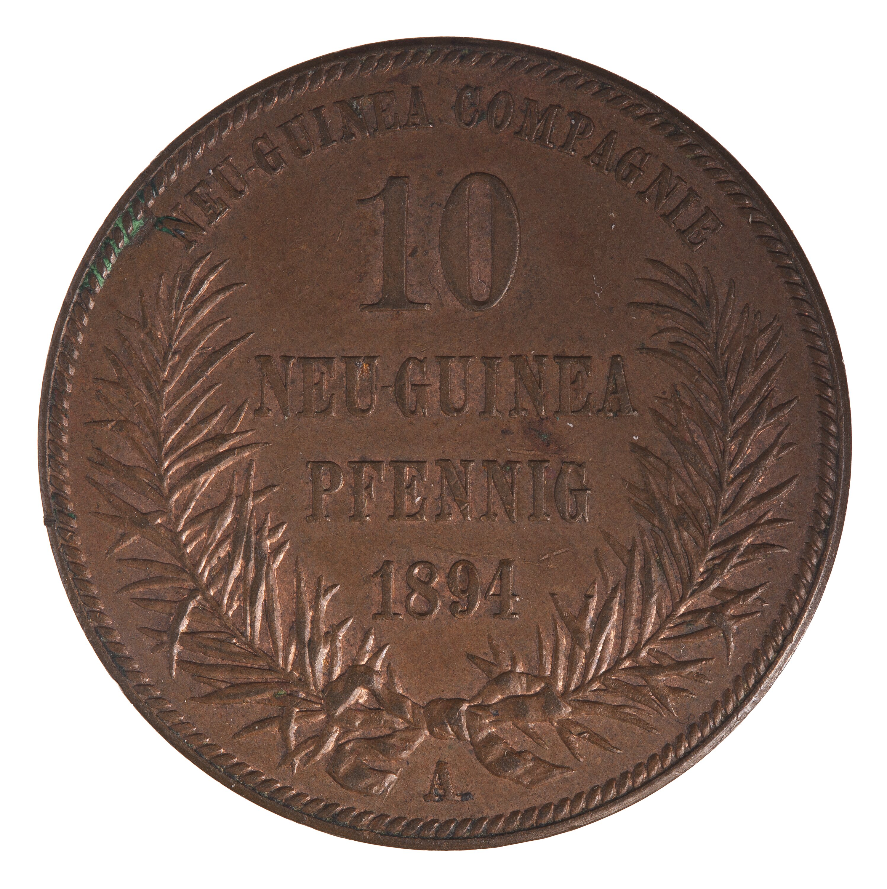 Within wreath, 10 / NEU GUINEA / PFENNIG / 1894; above, NEU GUINEA COMPAGNIE; below, the mint mark for Berlin "A"