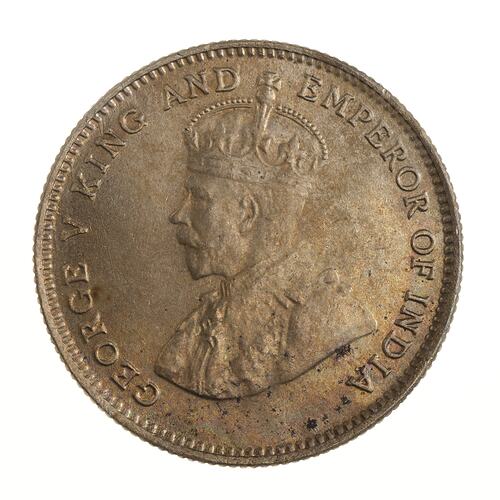 Crowned and draped bust of the King facing left, the King is wearing the Imperial Crown and the ermine Robe of State, the Collar of the Most Noble Order of the Garter, and the Badge of the Most Honourable Order of the Bath; around, GEORGE V KING AND EMPEROR OF INDIA; on bust truncation, the artist's initials, BM