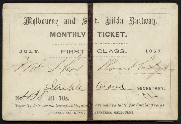 Monthly Ticket - Melbourne & St Kilda Railway July 1857. First class. No. 438 . Issued to Mr Routledge. Printed by Sands & Kenny.