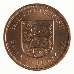 Plain shield charged with three lions, passant guardant in pale (ie. walking to left with heads facing viewer arranged beneath one another); above, BAILIWICK OF JERSEY; below, HALF NEW PENNY 1971
