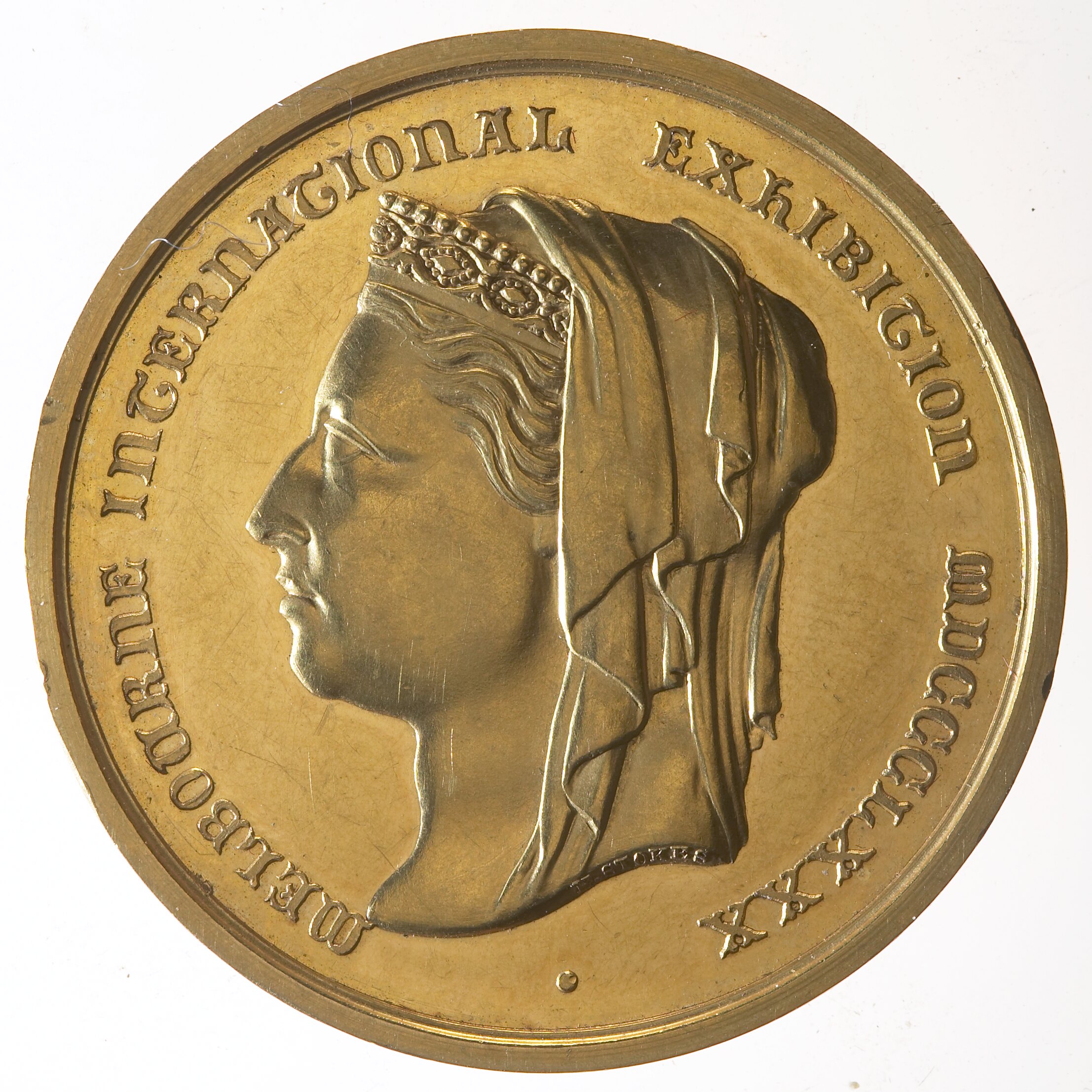 Gold medal awarded to the Executive Commissioner for New Caledonia W.J. Daly for services. It features a head of Queen Victoria facing left wearing coronet and veil by Harry Stokes (name on truncation), with the legend MELBOURNE INTERNATIONAL EXHIBITION MDCCCLXXX : The reverse has the legend "VITAM / EXCOLVERE / PER ARTES" WITHIN A CLOSED OLIVE WREATH and the artist's name H. STOKES in small letters at the bottom