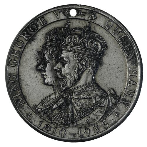 This is probably a medal struck in the United Kingdom promoting wine export as much as commemorating the 25th jubilee of the ascension of George V. It emphasized connections to the Empire, bearing both the images of King George and Queen Mary, the royal crest and the inscription 'GOOD FOR YOU / GOOD FOR THE EMPIRE'. Emu Wines was a South Australian company established in the mid-19th century. It made wines, operated a distillery and exported its own and other wines. It was well-known for its sherry. Fifteen years after this medal was issued Emu bought the Houghton winery; in 1976 Thomas Hardy & Sons acquired the stock of the London-based parent company of Emu Wine Co Ltd / Houghton Wines. The medal was used in Export section of 'Sip in Time' wine history exhibition at Museum Victoria when it was located in Swanston Street.