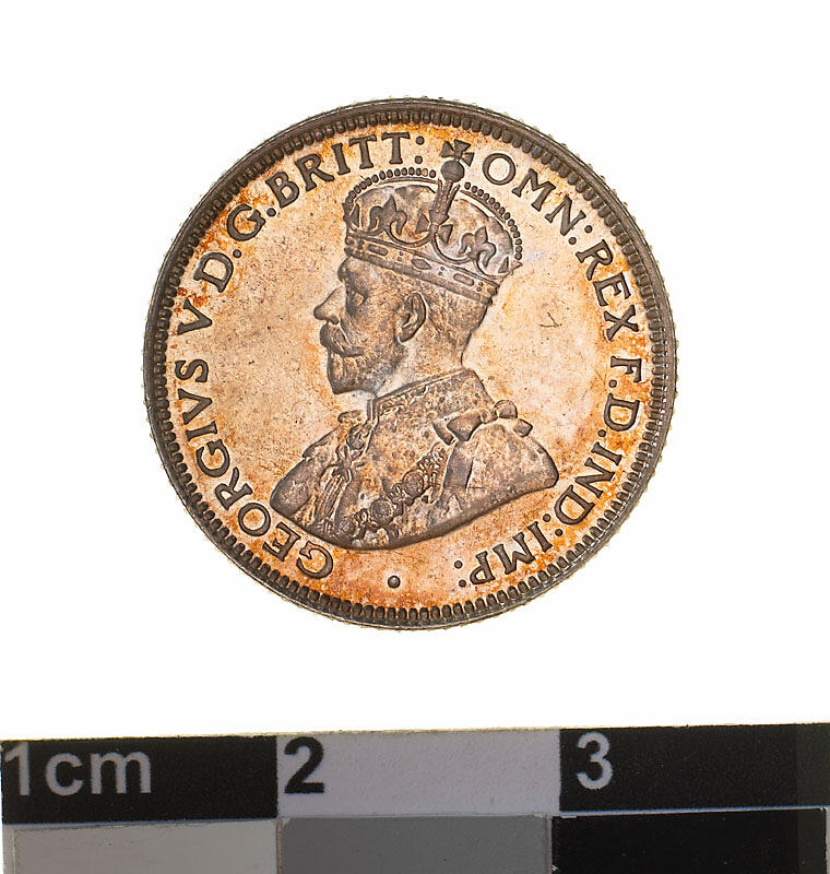 A silver coin (19 mm diameter with milled edge) featuring a crowned and robed bust of George V facing left; around, GEORGIVS V D.G. BRITT: OMN: REX F.D. IND: IMP: ; below bust in small lettering the artist's initials B.M.. The reverse features the Ensigns Armorial of the Commonwealth of Australia, as authorised by Royal Warrent 7th May 1908 - composed of a simple shield enclosing a cross of Saint George on which are five six-pointed stars, around the outside of which are six small escutcheons, i.e., small shields. The shield is supported by a kangaroo and an emu standing on a grassy mound. Above the shield a crest, the seven-pointed star of Federation on a wreath. Below on a ribbon the motto ADVANCE AUSTRALIA is inscribed. Around above, SIXPENCE and below, between arrow heads, the date, 1926.