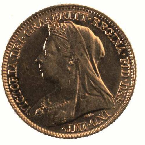 A gold coin (19 mm diameter with milled edge) featuring a crowned bust of Queen Victoria facing left, veiled and draped, wearing ribbon and Star of Garter; around VICTORIA . DEI . GRA . BRITT. REGINA . FID . DEF . IND . IMP . , the artist's initials, T.B. are below the bust. The reverse features St. George on horseback holding short sword in right hand, wearing a flowing cape, helmet and boots; the horse rearing to right over a fallen dragon which has a broken lance in its chest; the date, 1896 in the exergue. The mint mark M is in the ground above the middle of the date.