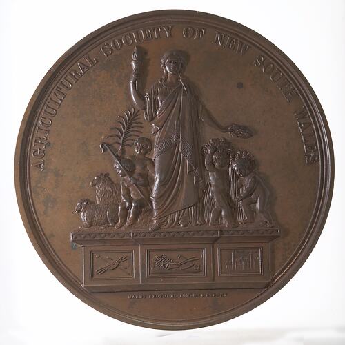 New South Wales, standing facing, holding a lit torch and a Victor's wreath, around her four children harvest wheat, carry grapes and; below on three panels art, agriculture and industry are representeed. tend sheep; around above, AGRICULTURAL SOCIETY OF NEW SOUTH WALES in small letter below HARDY BROTHERS LONDON & SYDNEY