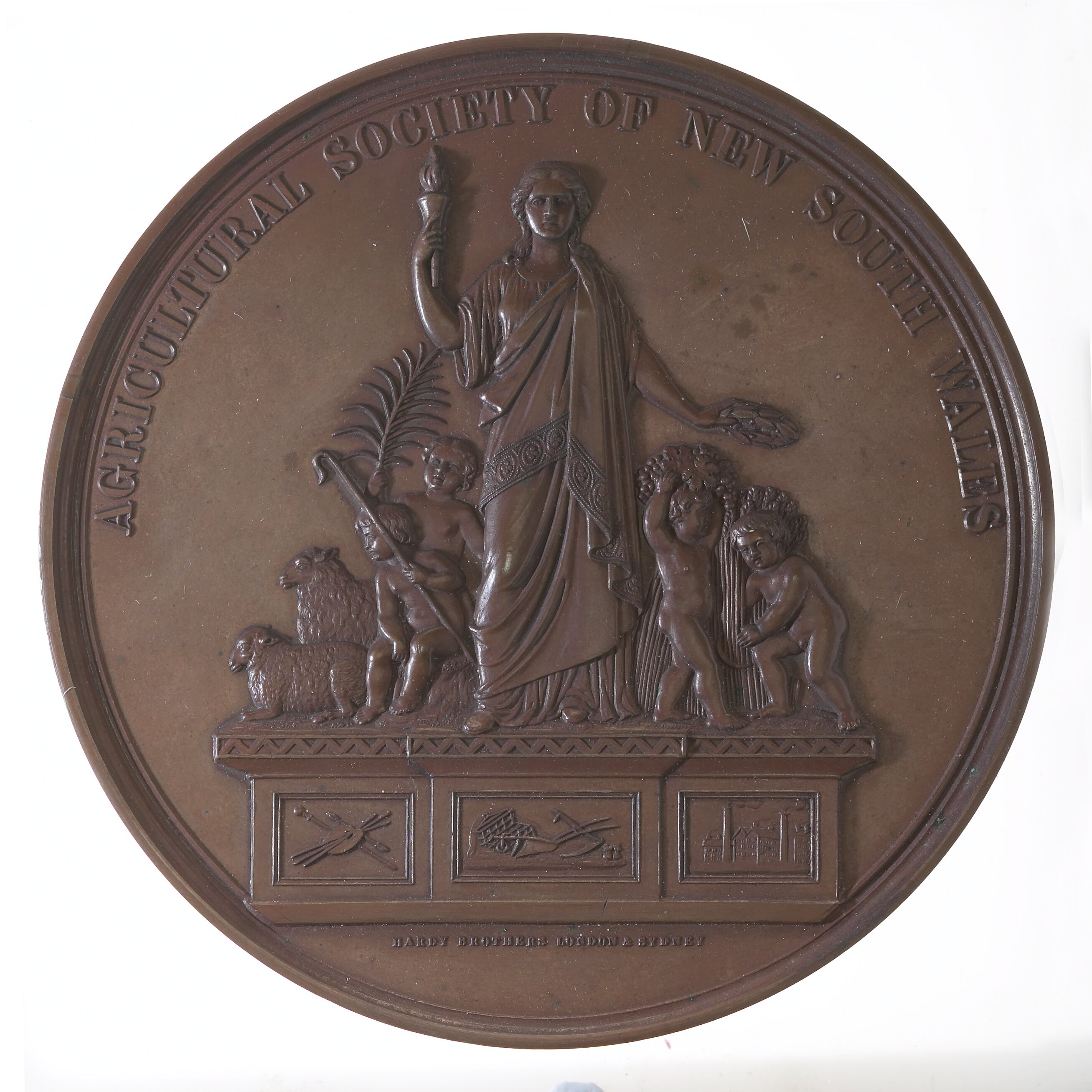 New South Wales, standing facing, holding a lit torch and a Victor's wreath, around her four children harvest wheat, carry grapes and; below on three panels art, agriculture and industry are representeed. tend sheep; around above, AGRICULTURAL SOCIETY OF NEW SOUTH WALES in small letter below HARDY BROTHERS LONDON & SYDNEY