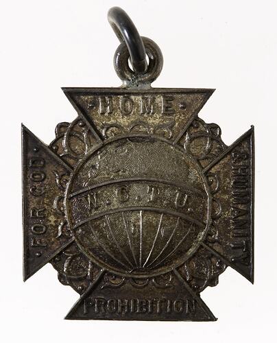 Cross shaped badge with globe at centre; across globe, W.C.T.U.; on arms of cross, .FOR GOD. .HOME. & HUMANITY PROHIBITION