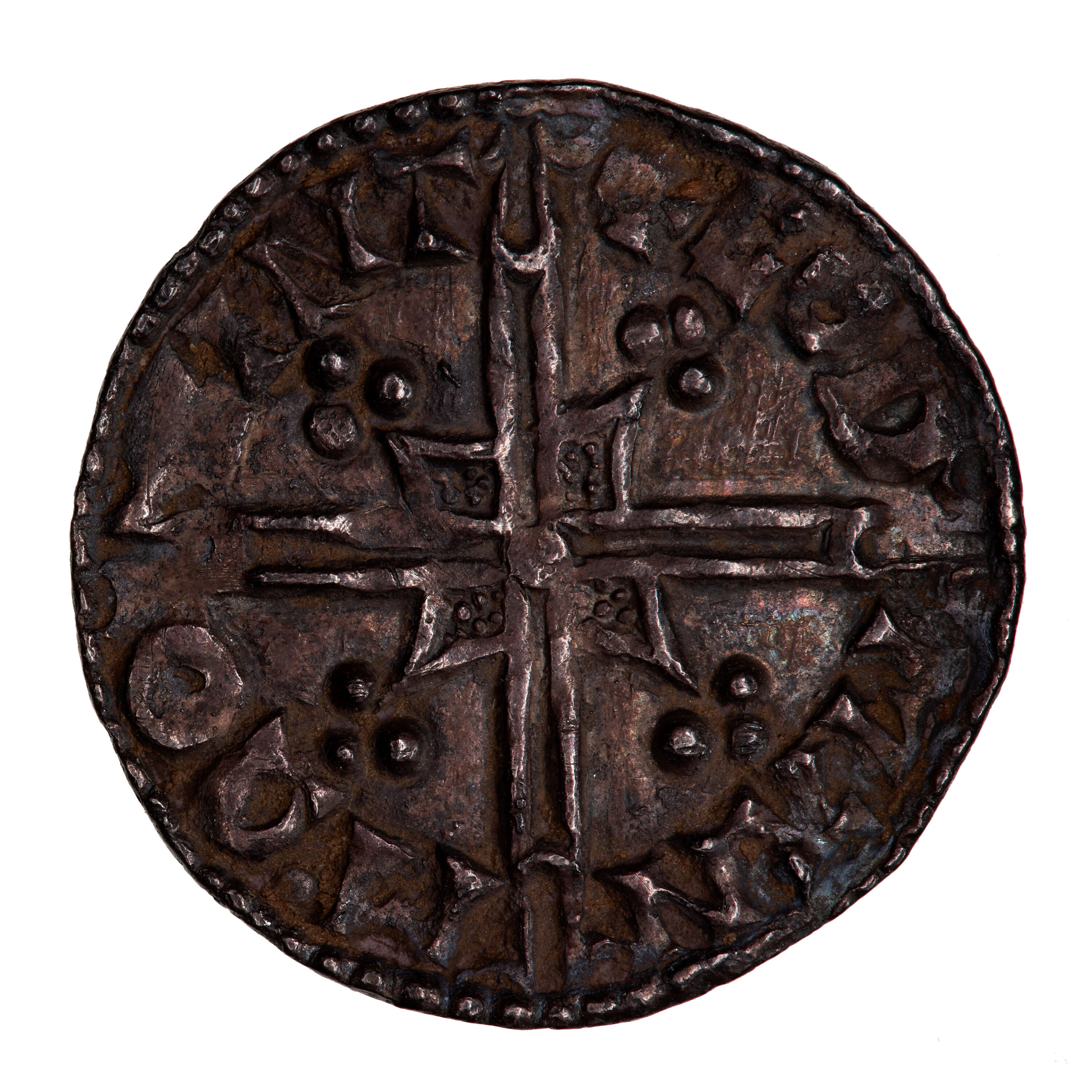 A long cross voided set above a square with trefoil on each point; around, + GOD MAN MOO LINT (Godman moneyer Winchester)
