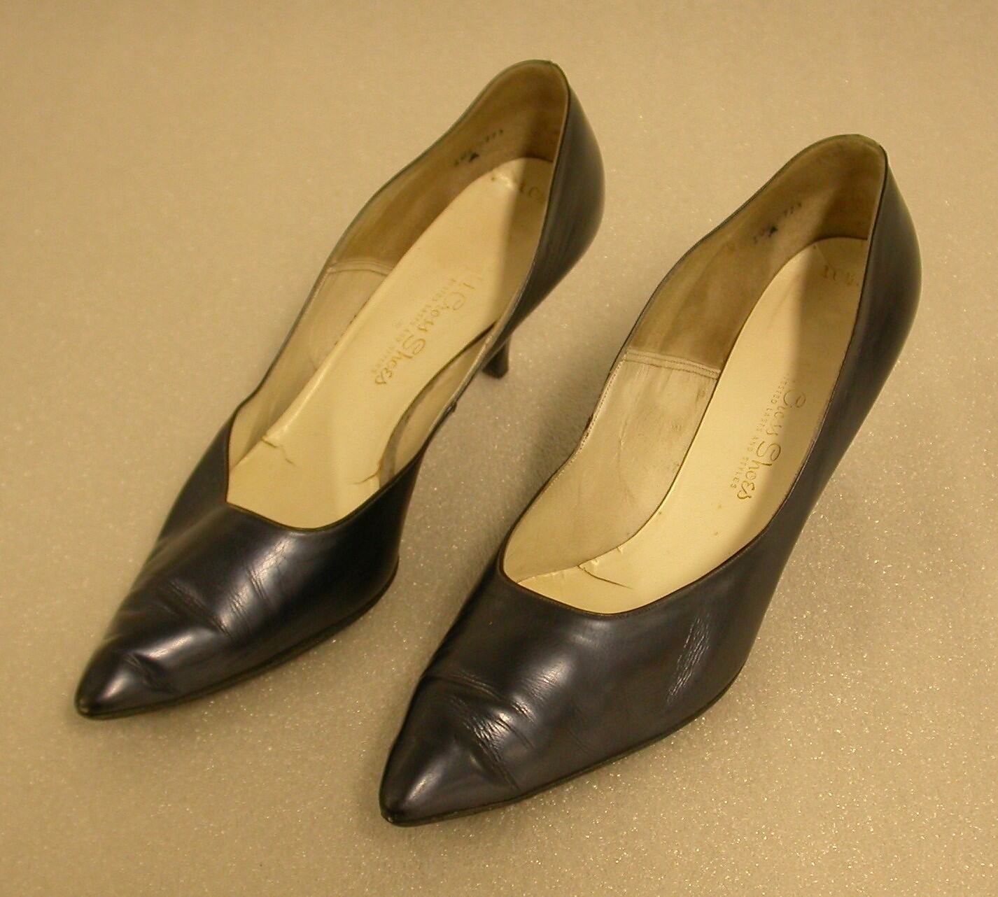 Pair of woman's navy blue court shoes, size 10 ½ A, were made by Gold Cross Shoes and purchased around 1960-64. The donor found them uncomfortable and didn't wear them much. She did wear them as a bridesmaid, however.