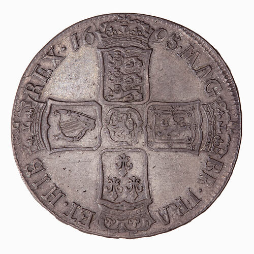 Crowned shields of England, Scotland, France and Ireland forming a cross shape around the arms of Nassau at the centre; around, MAG BR FR ET HIB REX ET 1698, the date being divided by the crown over the shield of England. The 8 of the date over a 7.