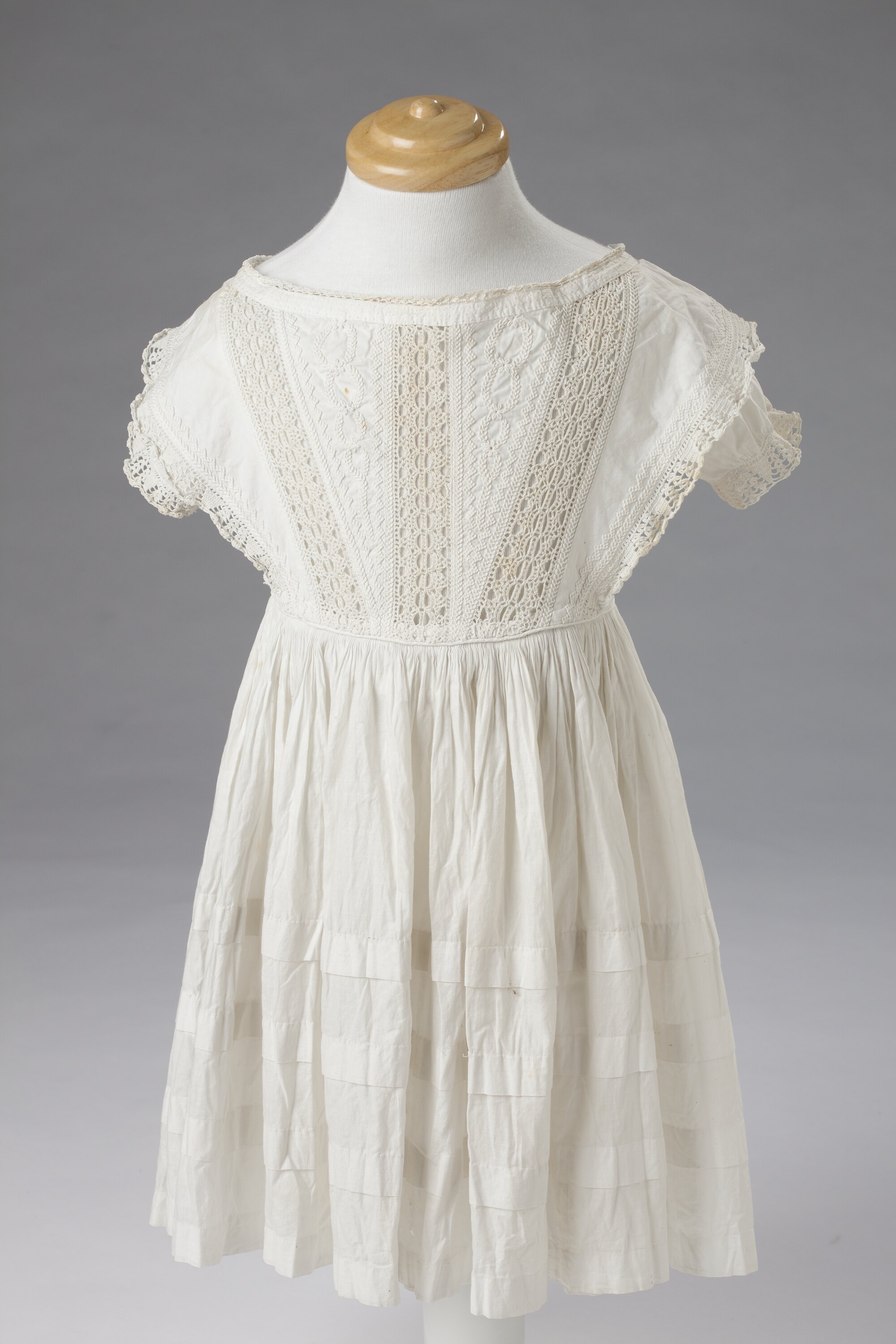 White cotton, hand sewn, boat neck dress with short sleeves trimmed with lace. Cotton and lace layer over the sleeves tapers into the waist, and forms a collar at the back. There is also lace and embroidery detail on the bodice and two ties at the back. The lower half of the dress has four tiers and is gathered to the waist under a section of piping detail. The back of the dress is slightly longer than the front.