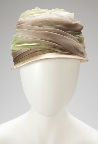 Turban-style hat, wrapped in green and brown chiffon or similar over cream base.